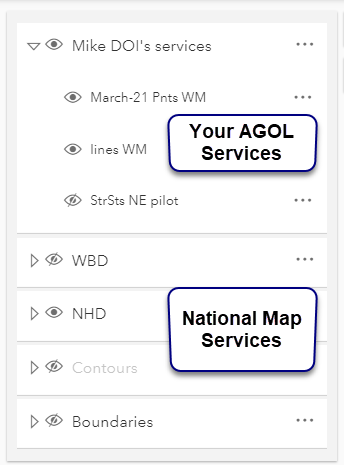 You can control the visibility of your services on AGOL, and can also the visibility of National Map service layers including WBD, NHD, Contours, Hillshade, and Boundaries.